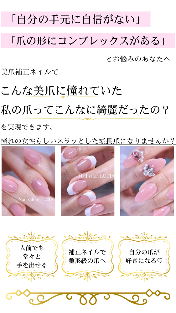 お爪を美しく魅せる補正と、経過も綺麗なフォルムが自慢のサロンです。